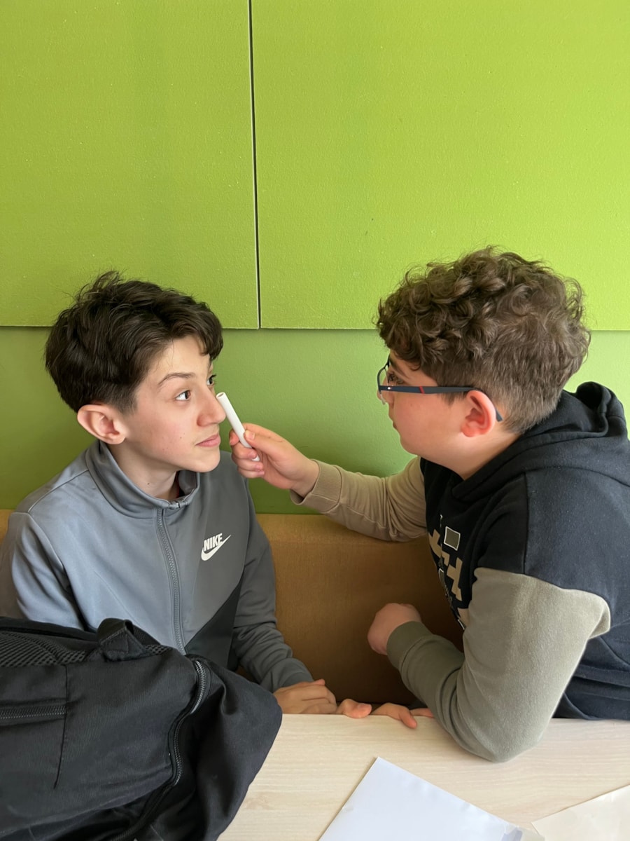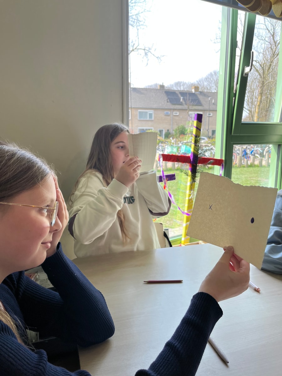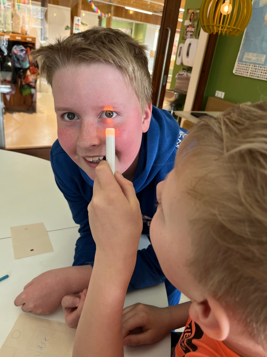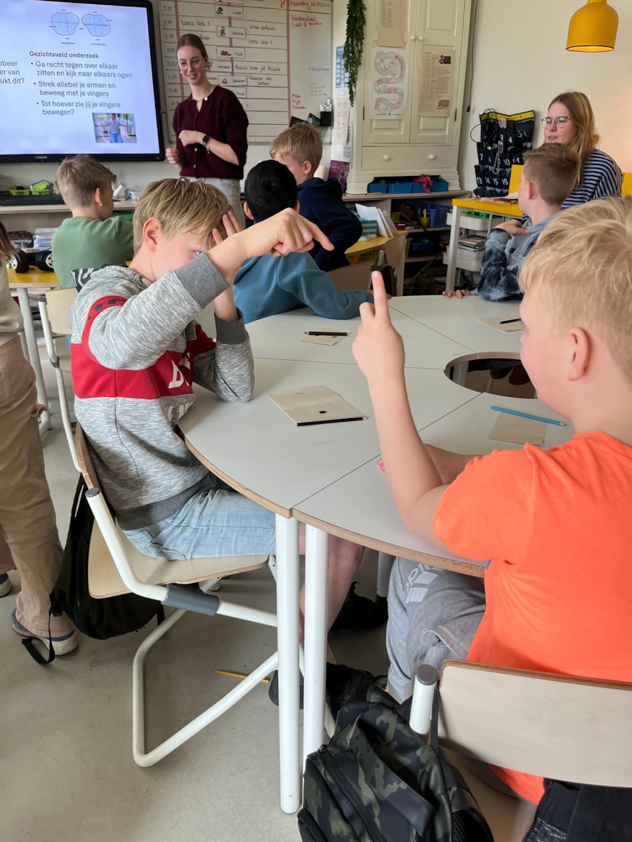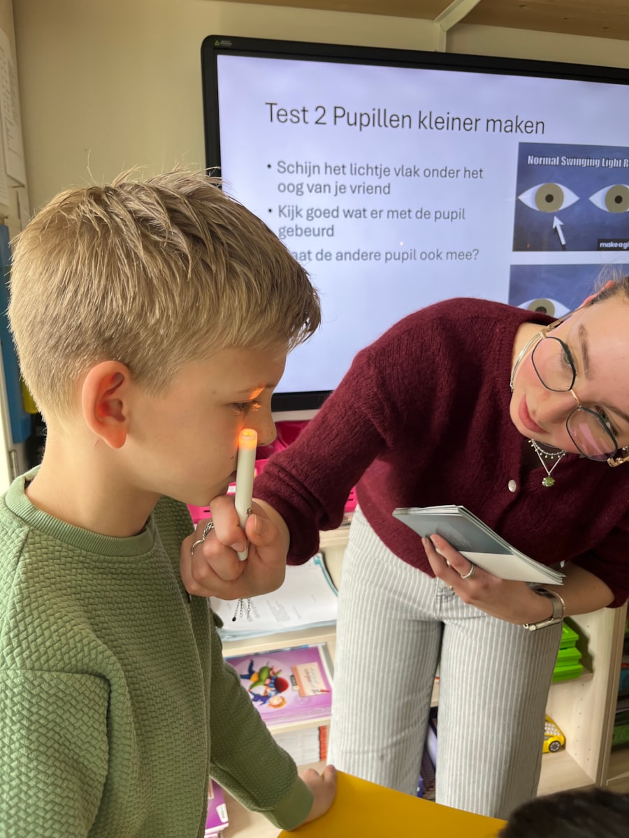 Naast de uitleg gingen de leerlingen zelf aan de slag met verschillende interactieve proefjes. Zo ontdekten ze hoe diepte zien werkt, keken ze door glazen met verschillende sterktes, onderzochten ze hun blinde vlek en zagen ze hoe pupillen groter en kleiner worden.