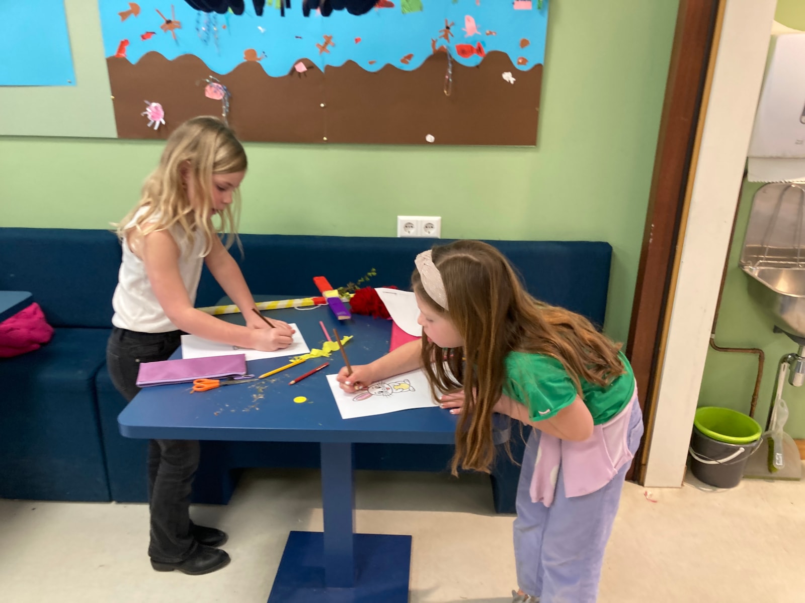 Deze week…stond o.a. in het teken van de paasviering, ons thema Waar is water?, lezen van woorden met ooi, aai, oei, turven, klokkijken en uitrekenen van plus- en minsommen, trommelen met juf Hanneke.