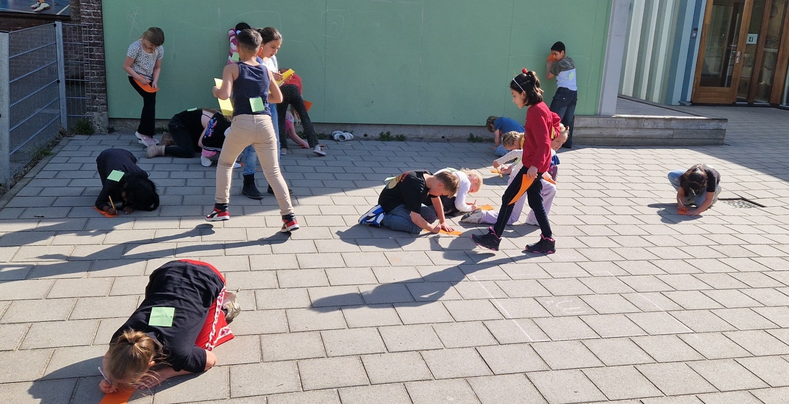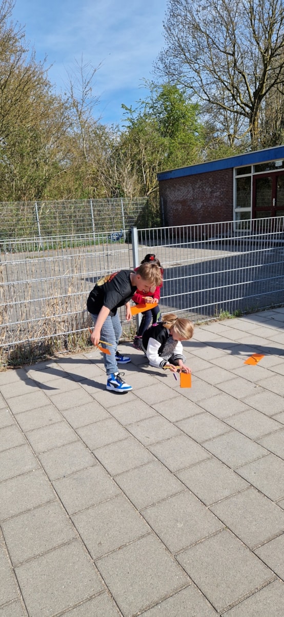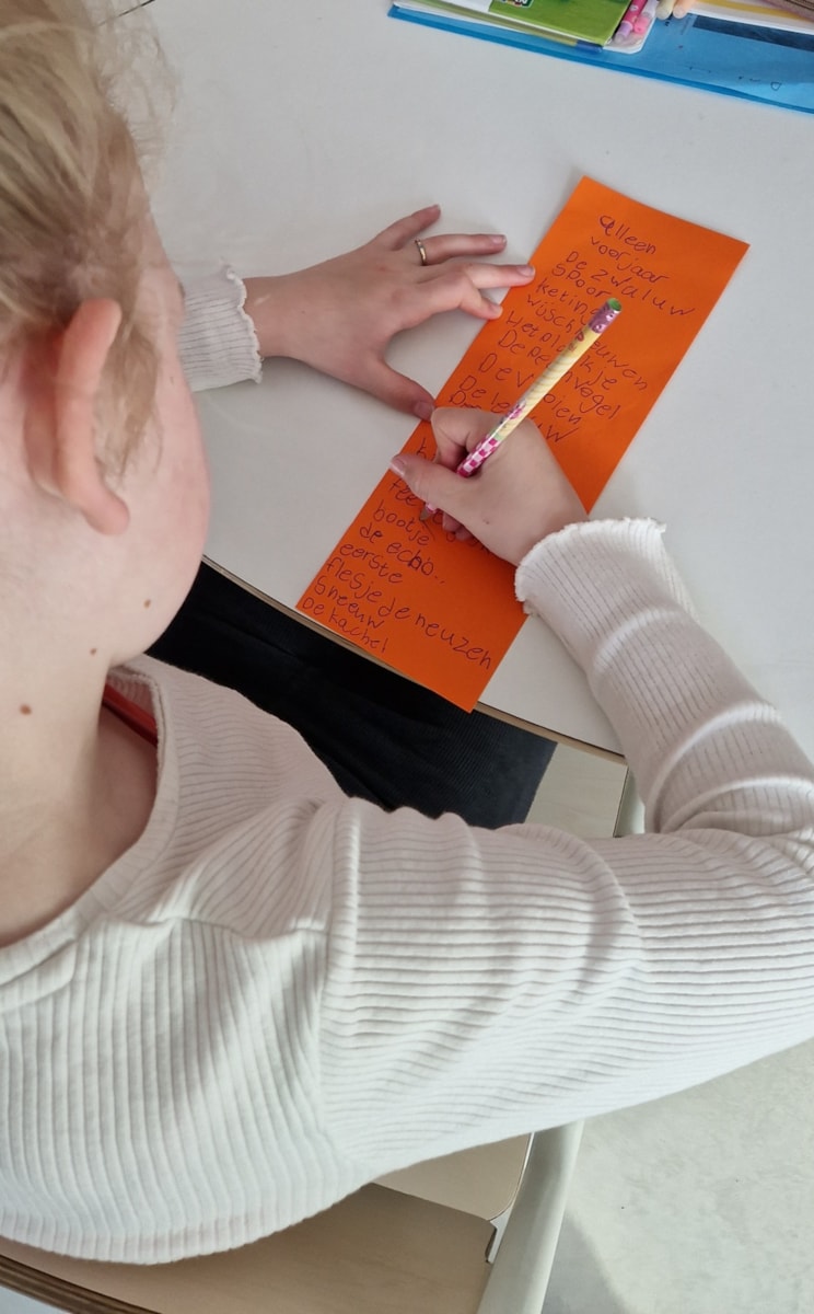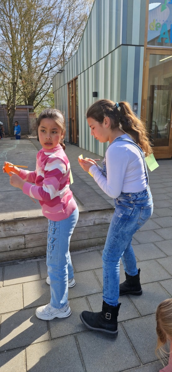 Vandaag was het prachtig weer om lekker buiten een dictee te maken. We schreven eerst in de klas een dicteewoord op en plakte deze op de rug van de ander. Daarna gingen we lekker naar buiten en moesten we zoveel mogelijk woorden bij elkaar zoeken en goed opschrijven. In de klas keken we alles na en maakten we mooie zinnen met onze opgeschreven dicteewoorden.